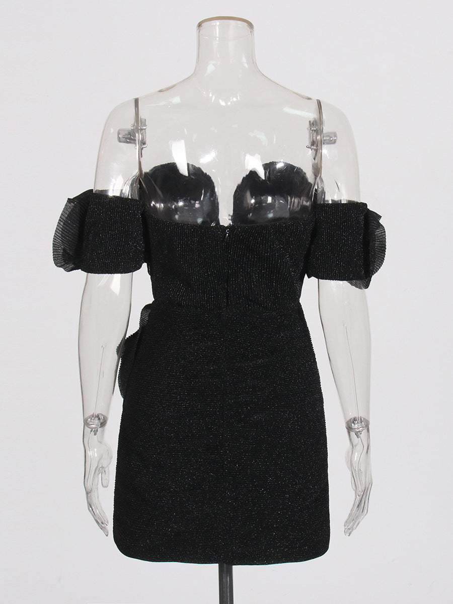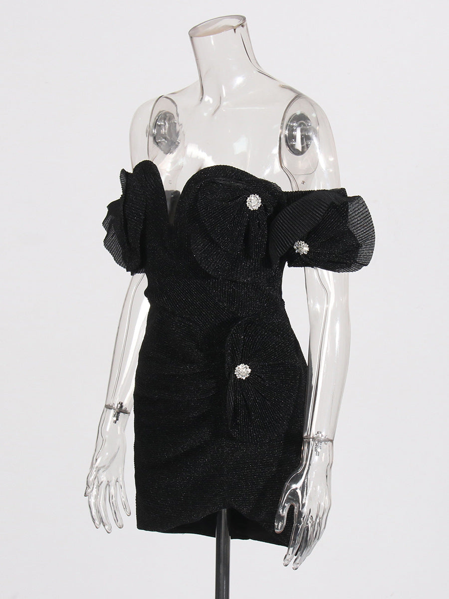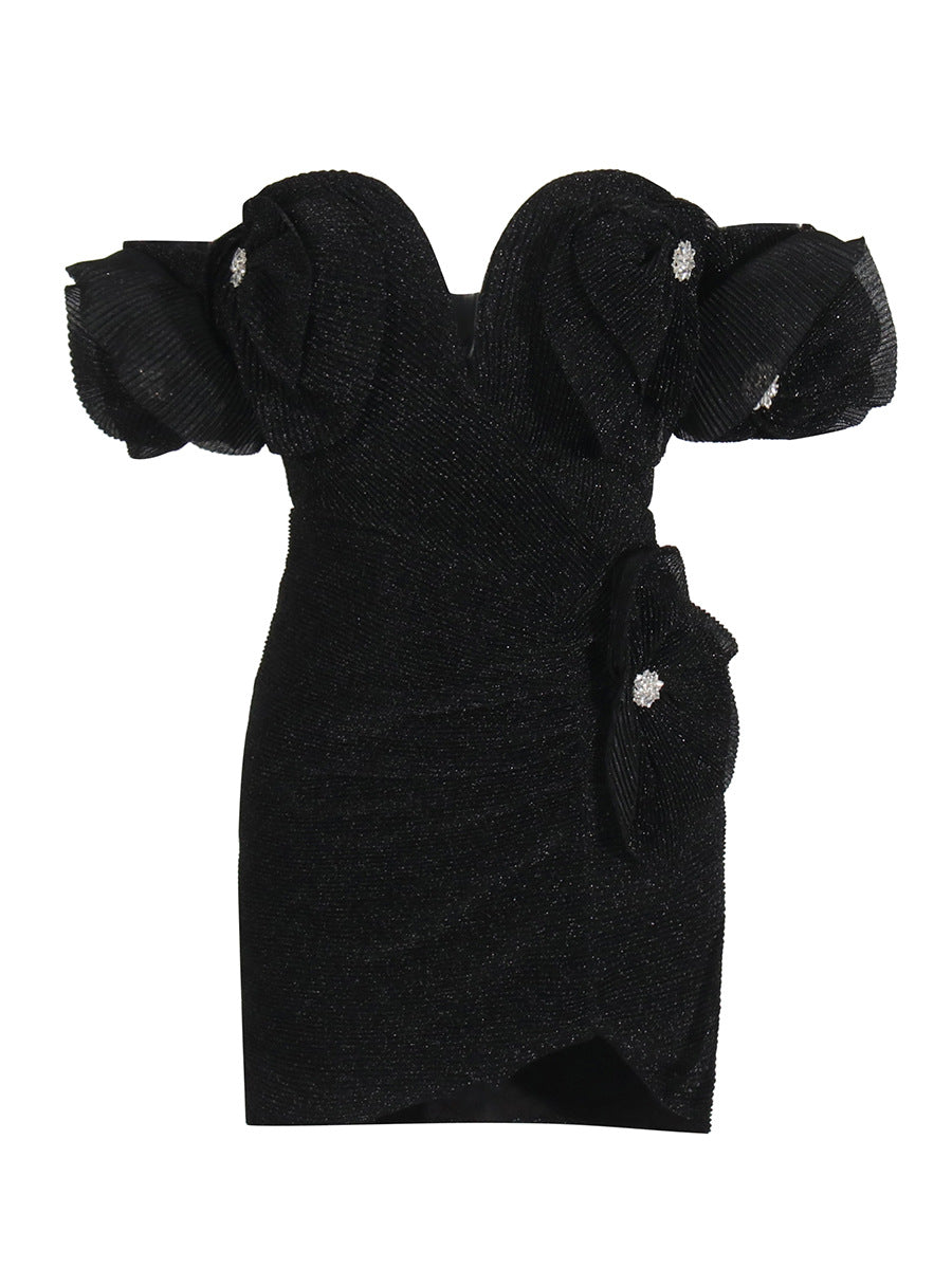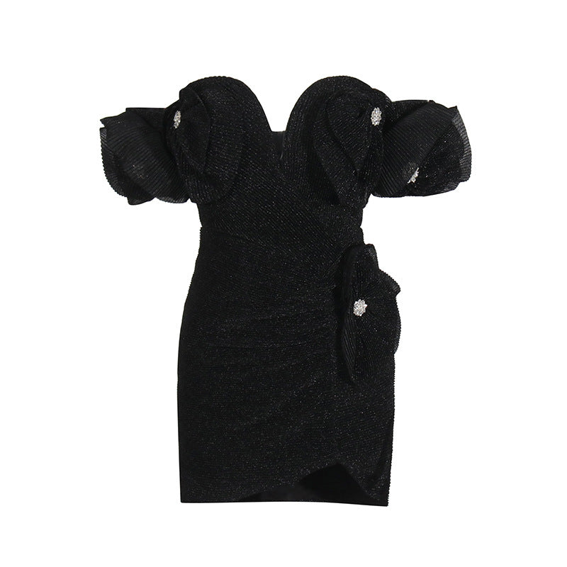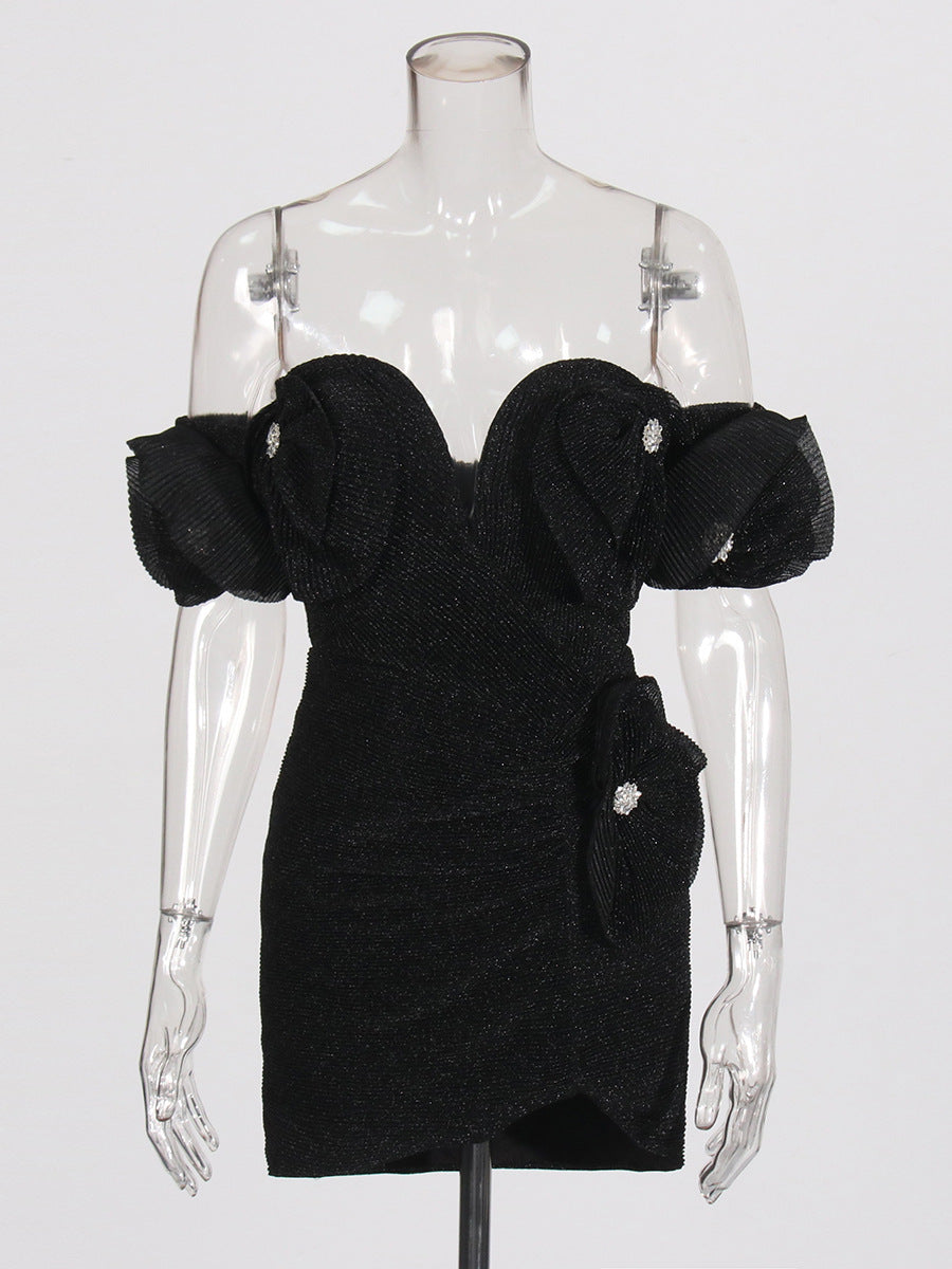 Folded Shoulder Three-Dimensional Flowers Splicing Short-Term Waist Small Dress 2025 Summer New Dress Woman