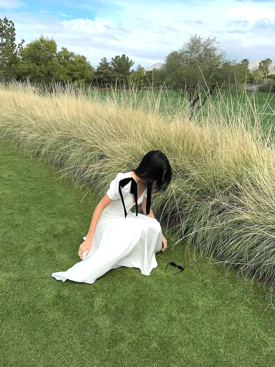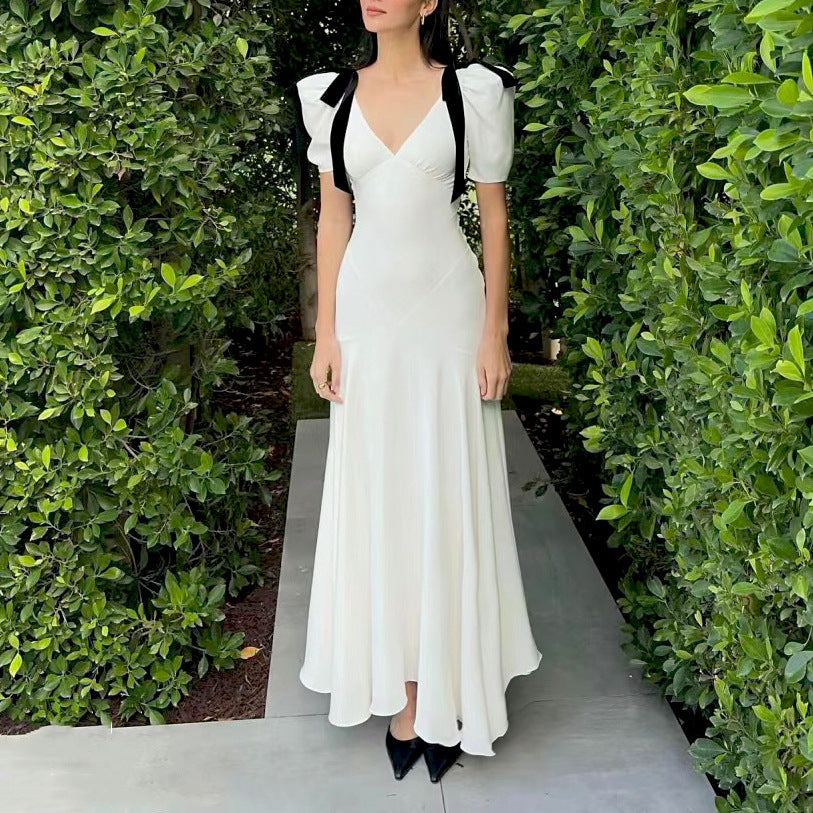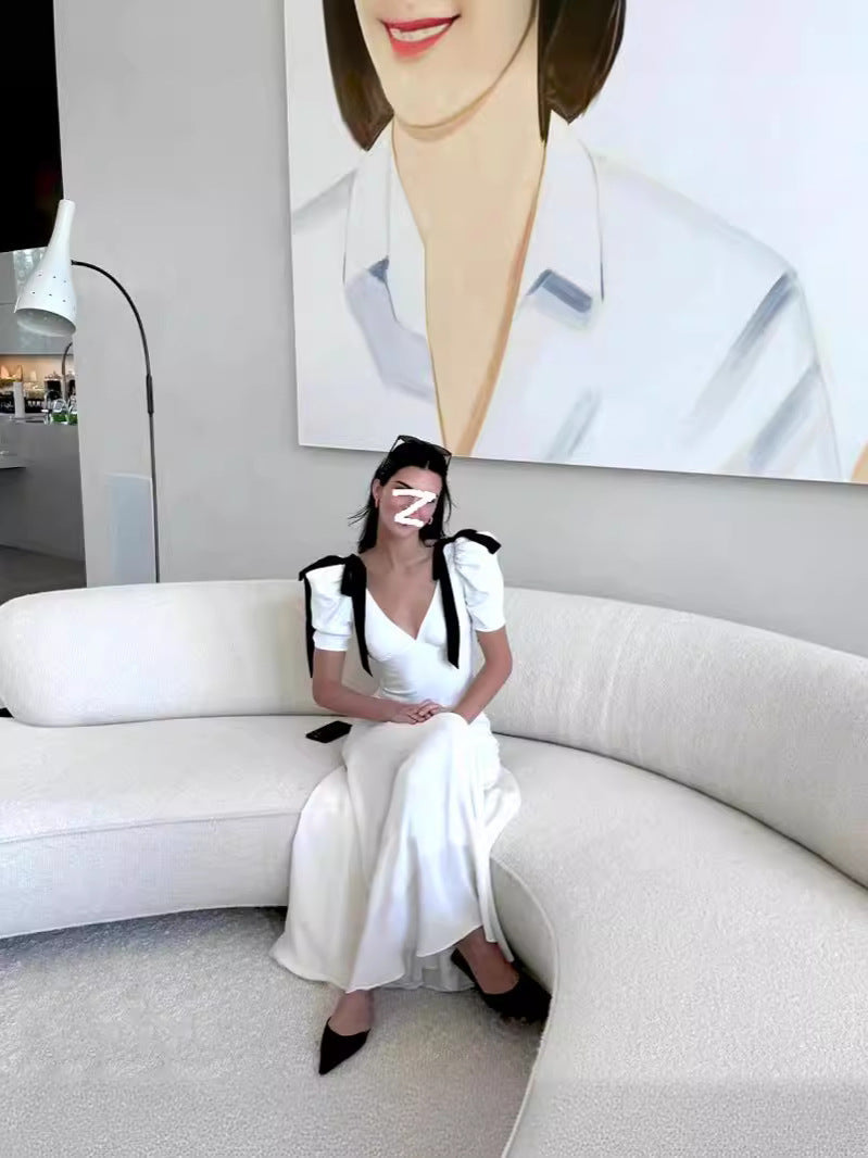Gentle Temperament Ken Bean The Same Spring 2024 White Deep V Bow Tidial Sleeve Dress