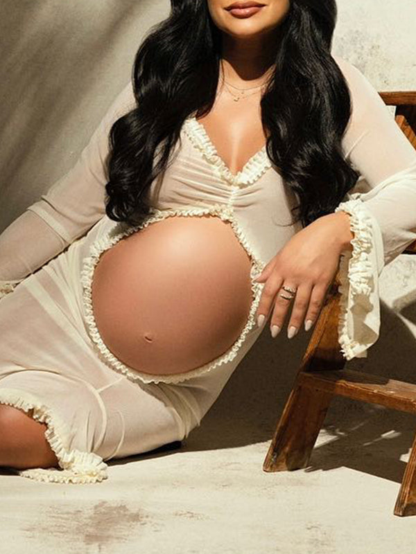 Ivory Sheer Ruffle Cut Out Crop Slit Falbala Deep V-neck Mermaid Elegant Maternity Photoshoot Maxi Dress Maternity