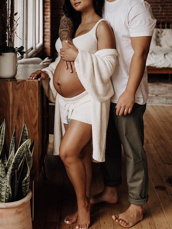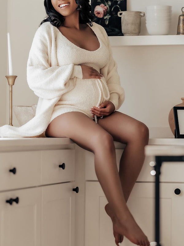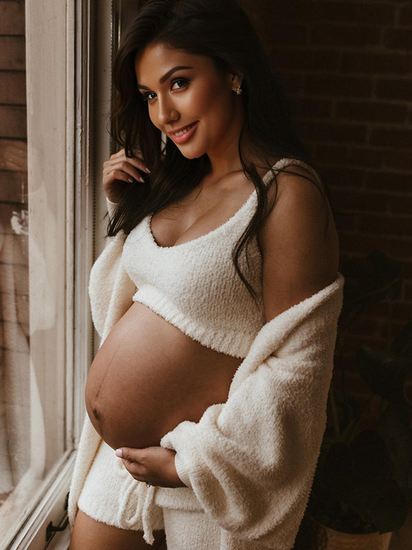 Ivory Three-piece Cozy Knit Set Plus Size Crop Top Cardigan Fluffy Loungewear Casual Daily Maternity Outfit Maternity