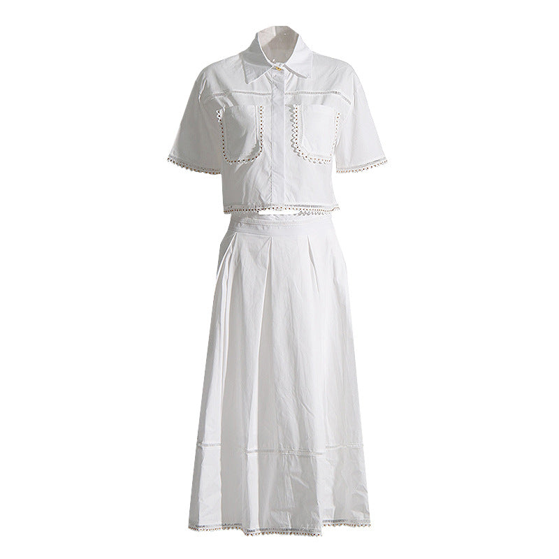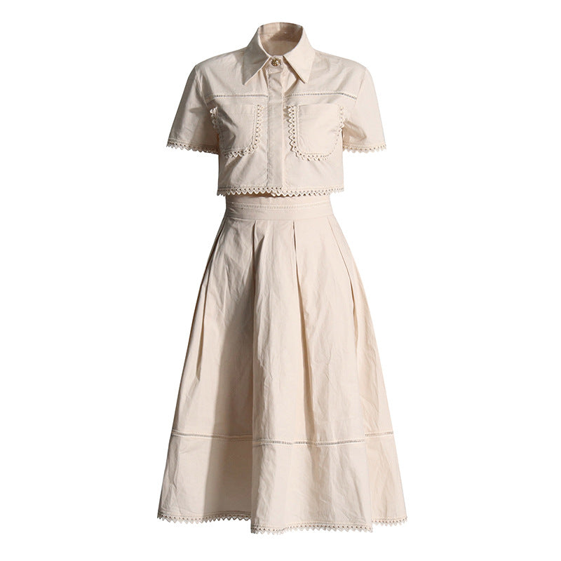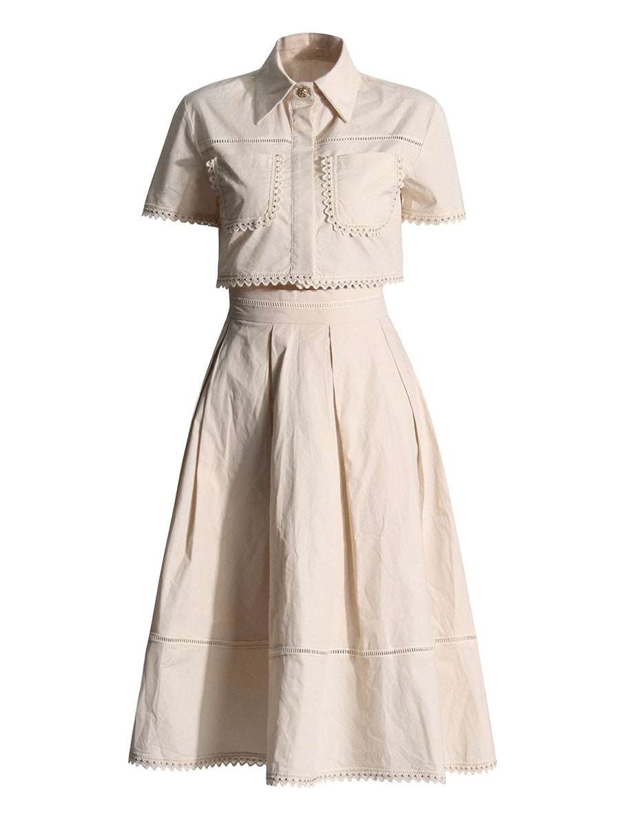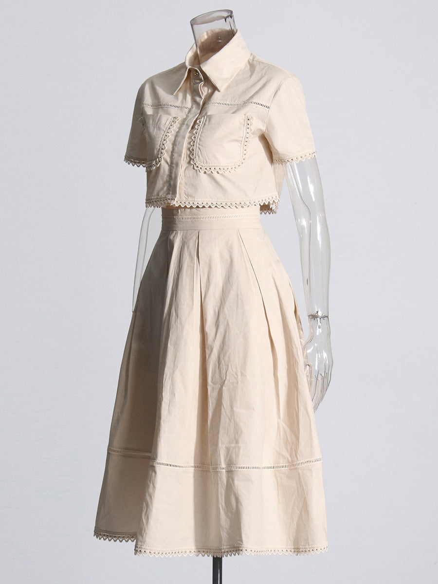 Lace Embroidery Set 2025 Spring New Collar Short-Sleeved Shirt High-Waist Long Dress Solid Color Woman