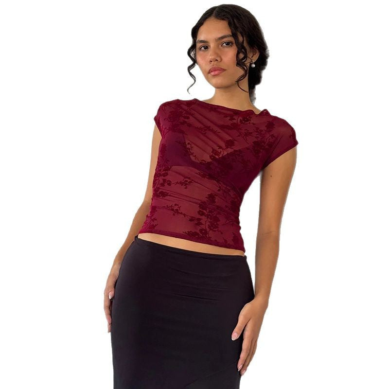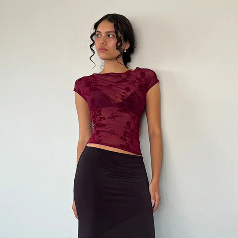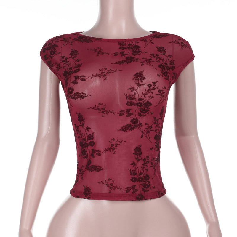 Mesh Perspective Hottie Retro Print Short-Sleeved T-Shirt Girl Ins Summer New Set Of Clothes DJPT