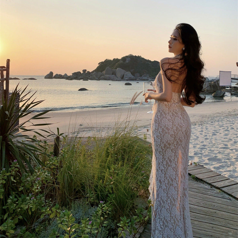 New Famous Sexy Lace Deep V-Neck Hanging Neck Dress Flowers Thin Leaves Side Open Fork Dress