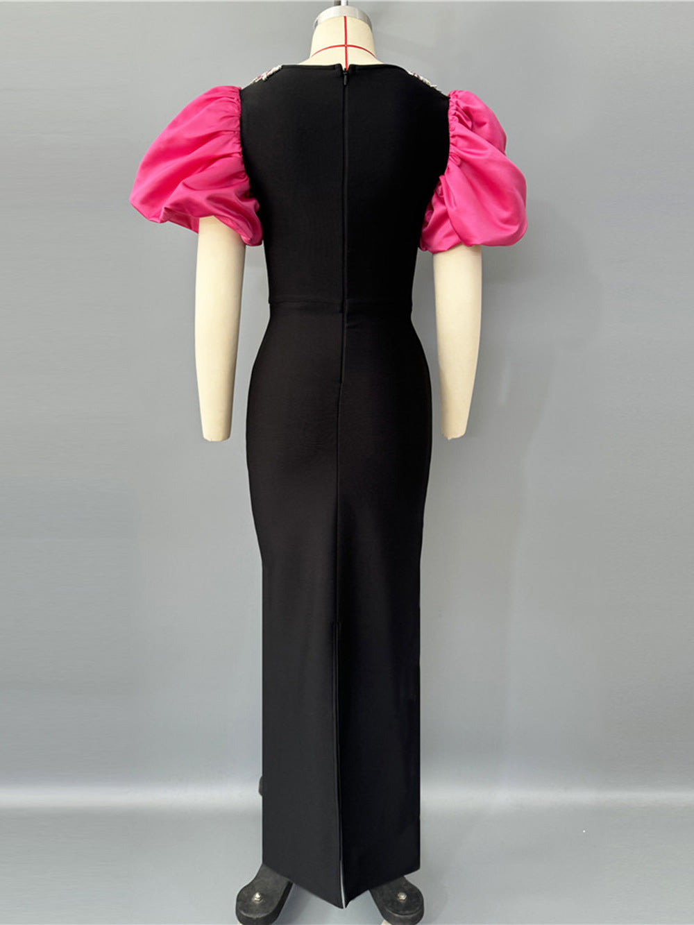 New Heavy Industry Diamond-Stuffed Temperament Rose Red Bubble Sleeve Banded Dress Banquet High-End Evening Dress