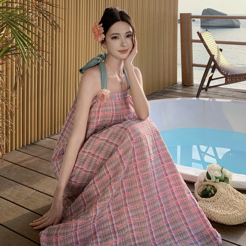 New Thai Sanya Beach Holiday Loose Retro Lattice Long Hanging Neck Tset Dress Summer