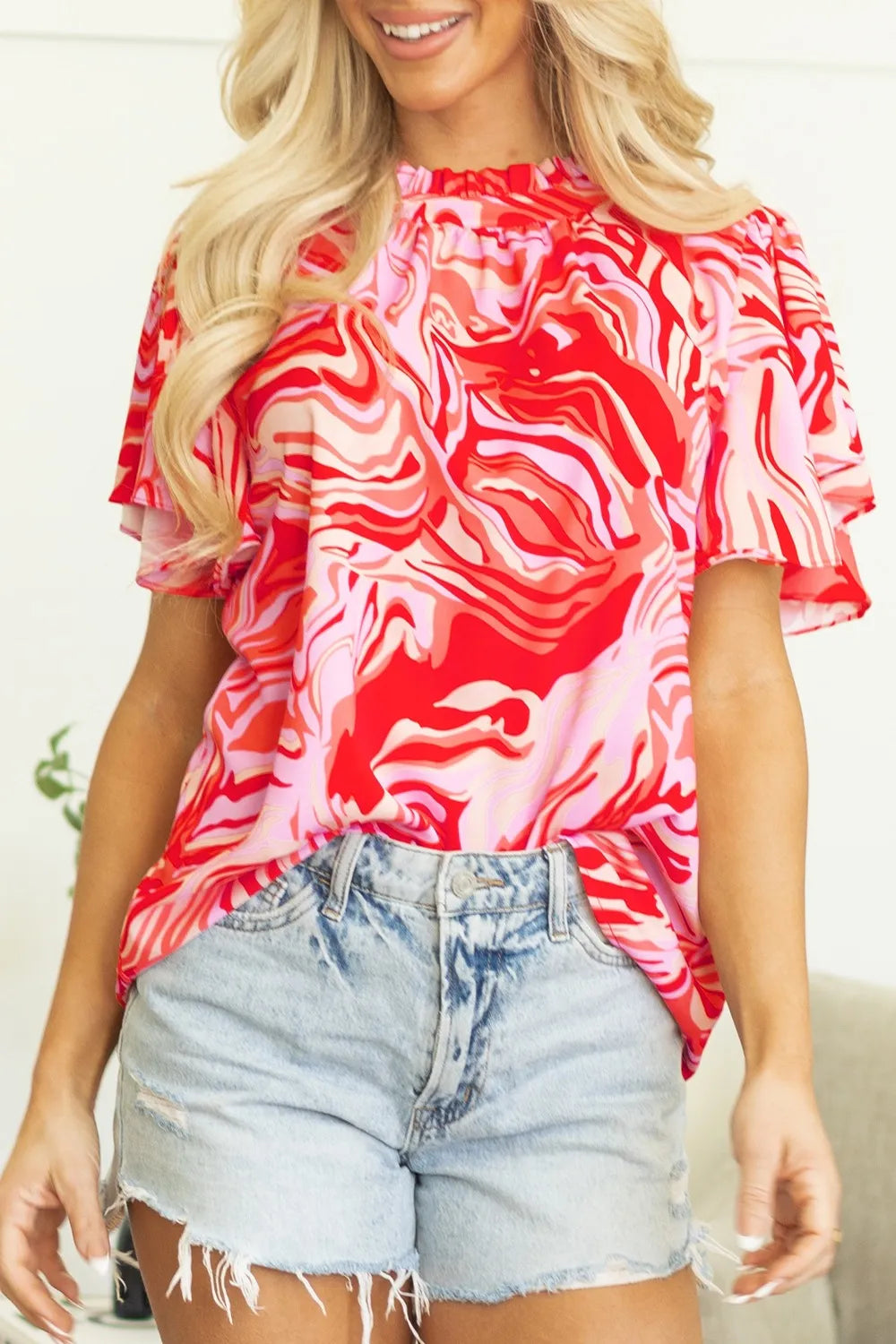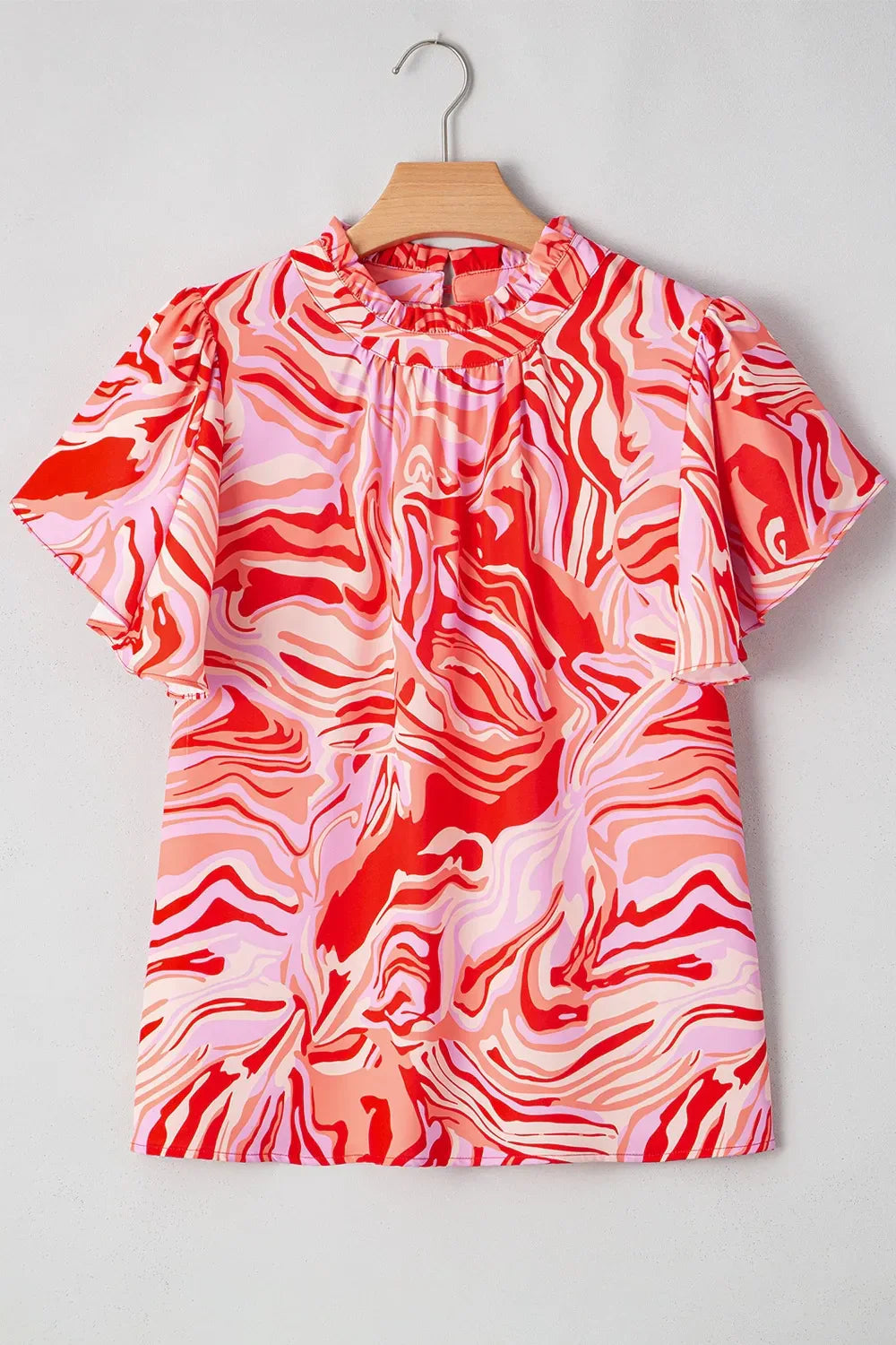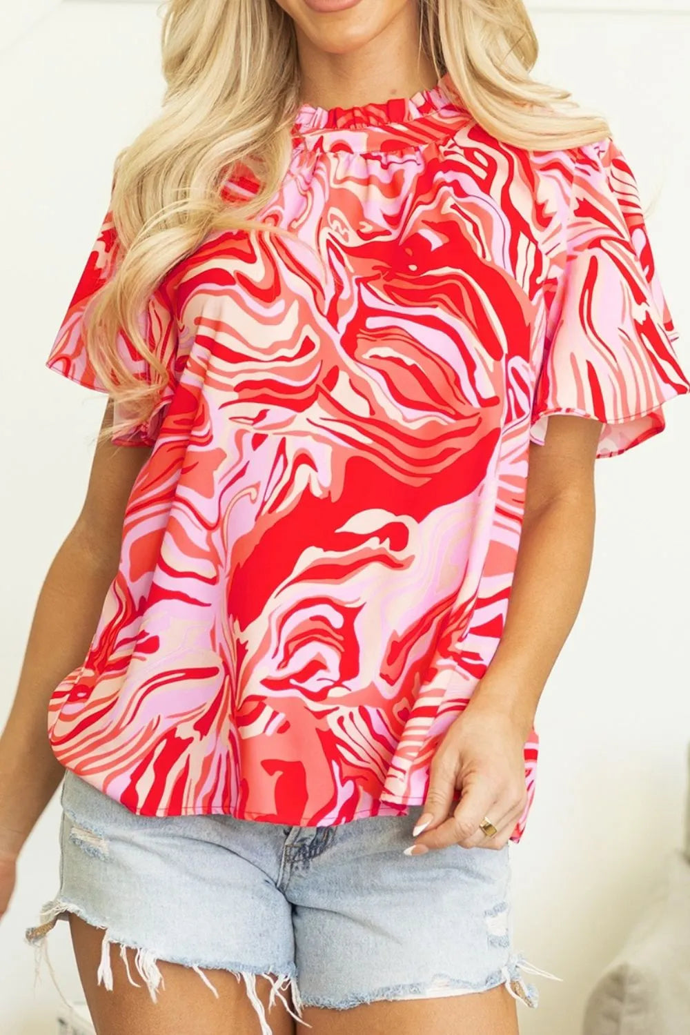 Print Ruffled Short Sleeve Mock Neck Blouse DJPT