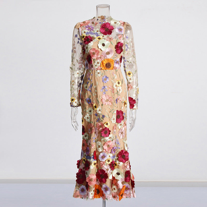Retro-Colored Floral Embroidery Design For The Summer Of 2025 New Round-Neck Long-Sleeved Heavyweight High-Waisted Dress Woman