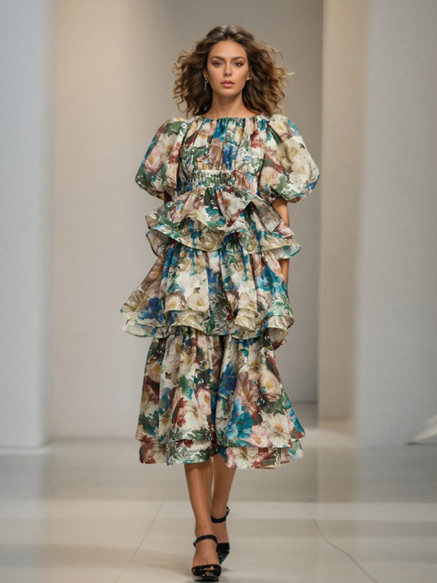 Retro Idyllic Cake Dress 2025 Summer New Multi-Layer Lotus Leaf Side Bubble Sleeve Print Dress Dress Woman