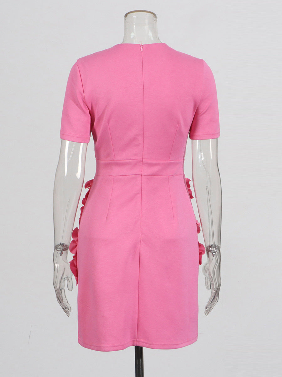 Retro Sexy Bag Hip Dress 2025 Summer New Round Three-Dimensional Flower Decoration Splicing Dress Woman