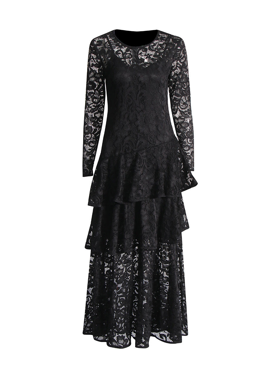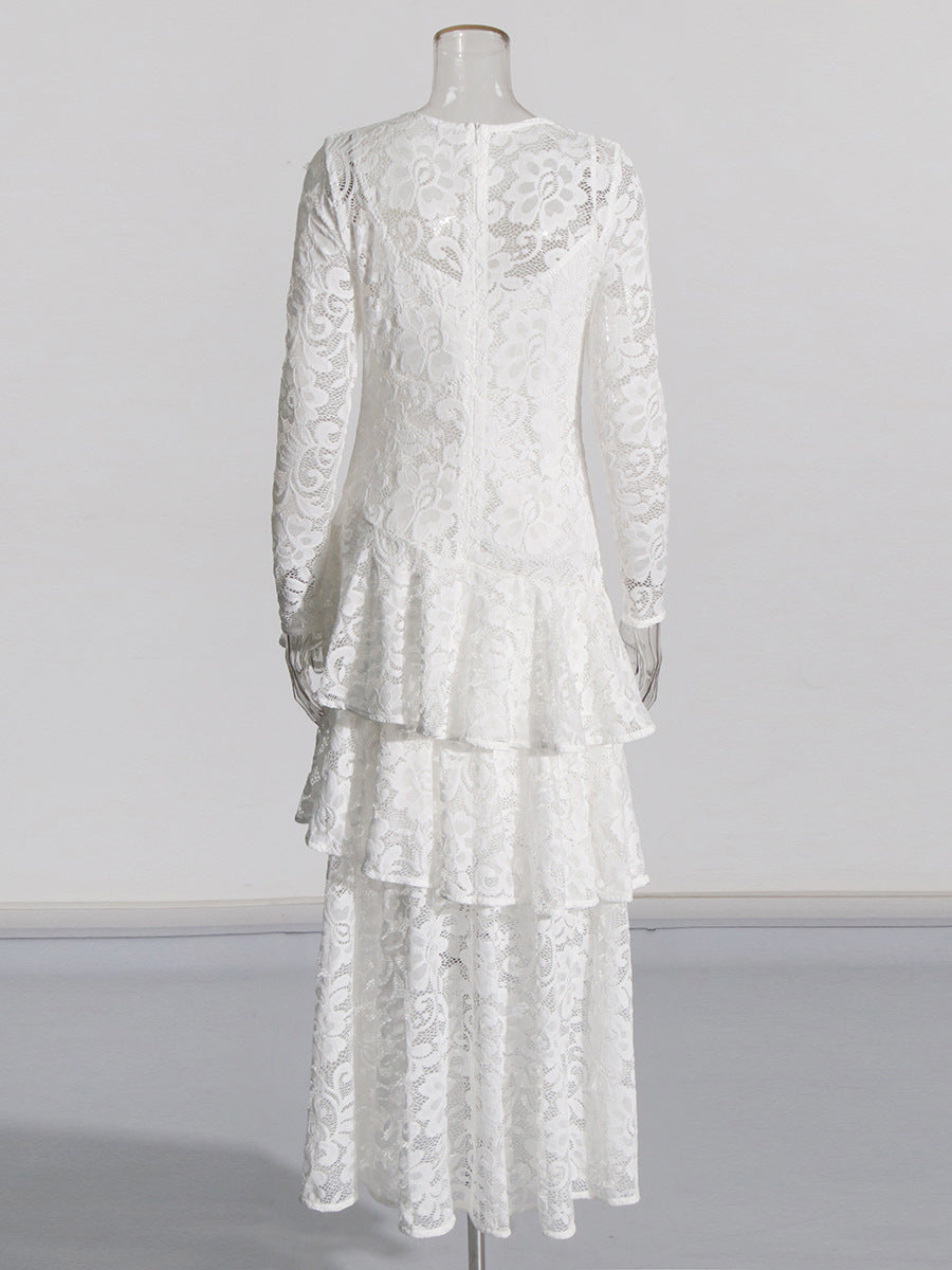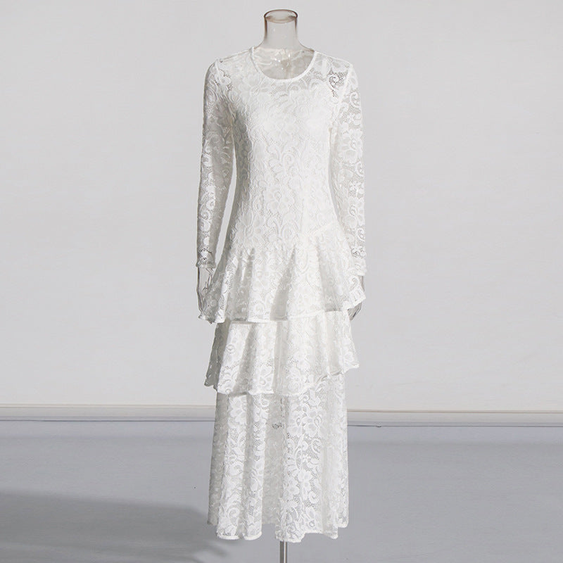 Retro Style Small Lotus Leaf Side Dress 2025 High-End New Round-Neck Long-Sleeved Lace Hollow Dress