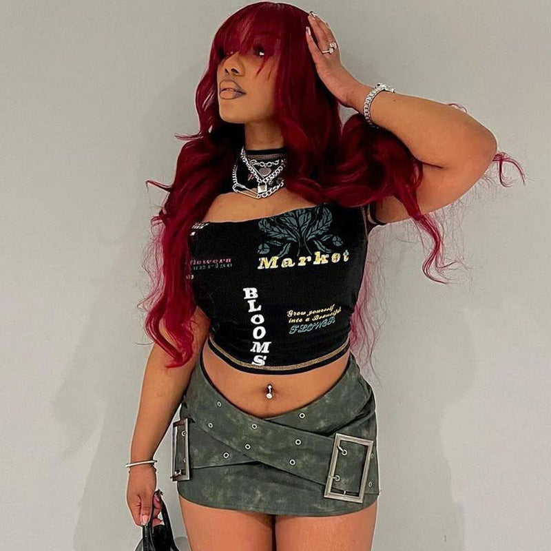 Round Collar Letter Print Sexy Hollow Short-Sleeved T-Shirt Girl New Hottie Fashion Top DJPT