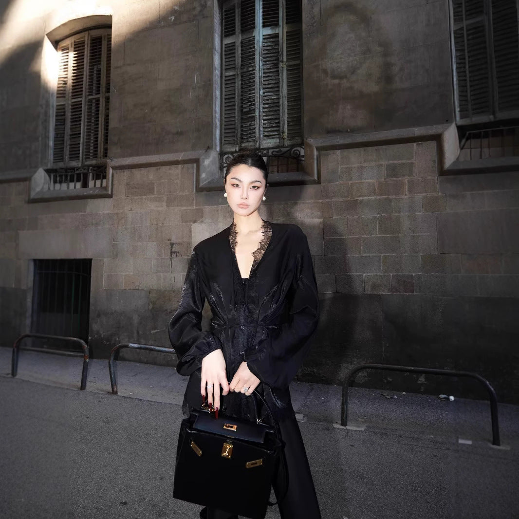 Sanguan Black V-Neck Long-Sleeved Lace Shirt Female New High-End Temperament Retro Bottoming Top