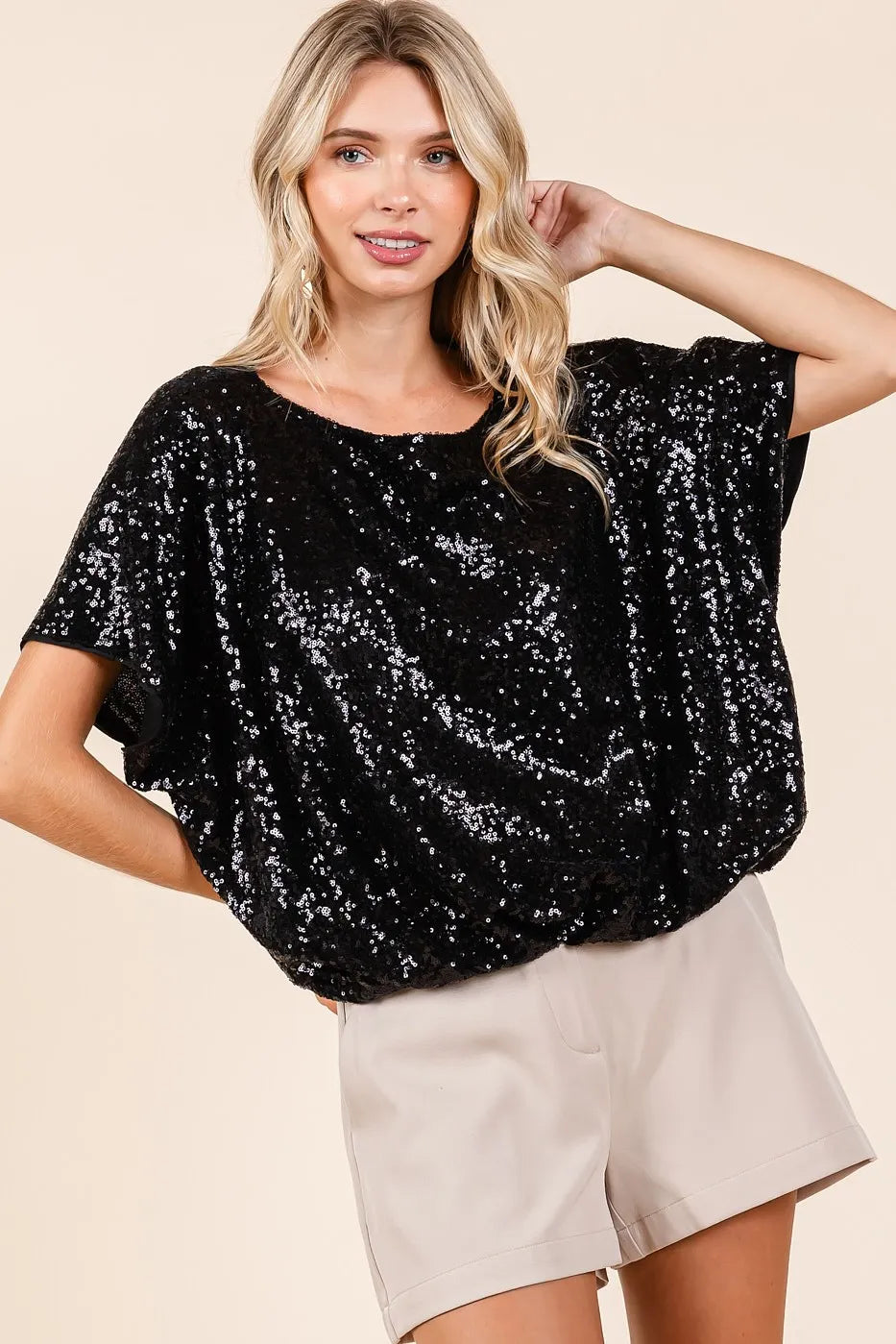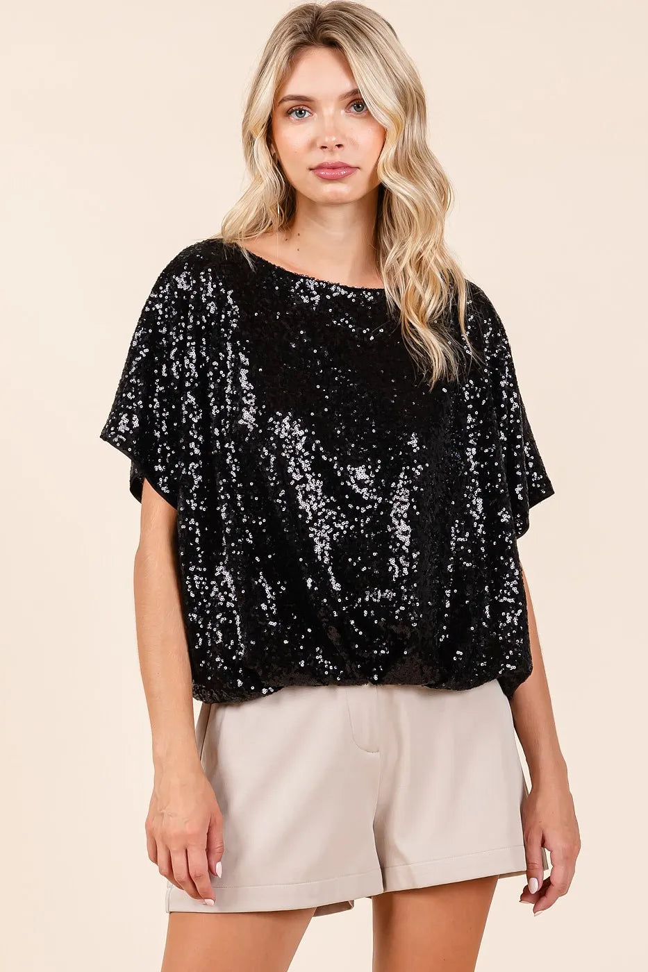 This short sleeve top features eye-catching sequins all over, perfect for adding some sparkle to your outfit. The elastic band hem provides a fitted and flattering silhouette. Ideal for special occasions or adding a touch of glamour to your everyday look. Shine bright in this sequin top with a stylish elastic band hem!