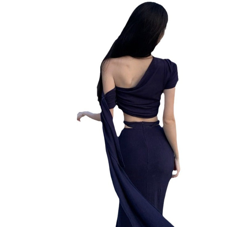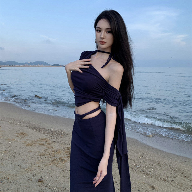 Sexy Seaside Travel Holiday Wind Inclined Shoulder Tightbage Bag Hip Fishtail Skirt Two Sets Early Autumn Wear