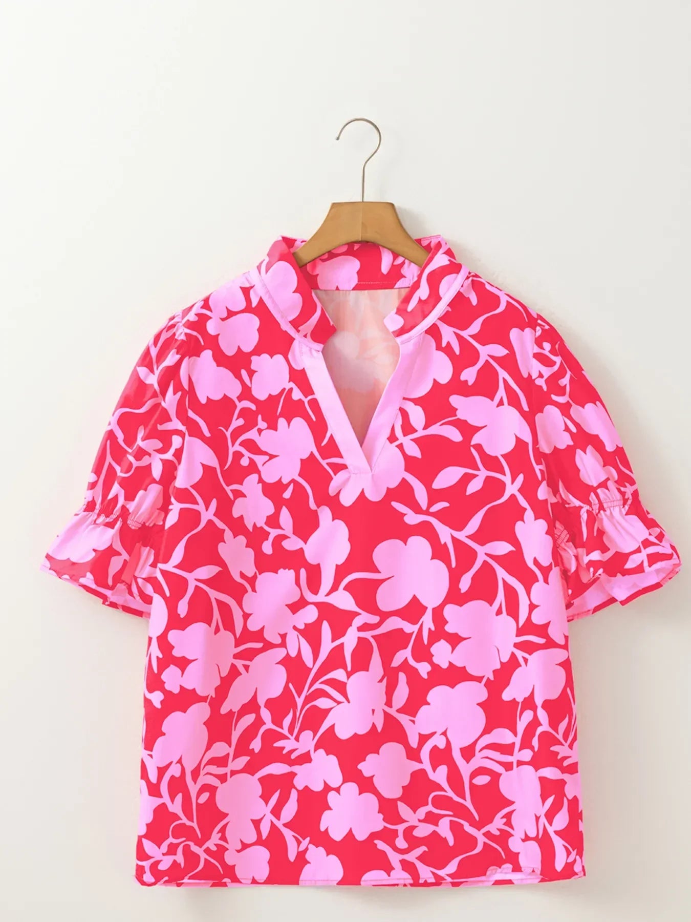Split V Neck Ruffled Short Sleeve Blouse Top DJPT