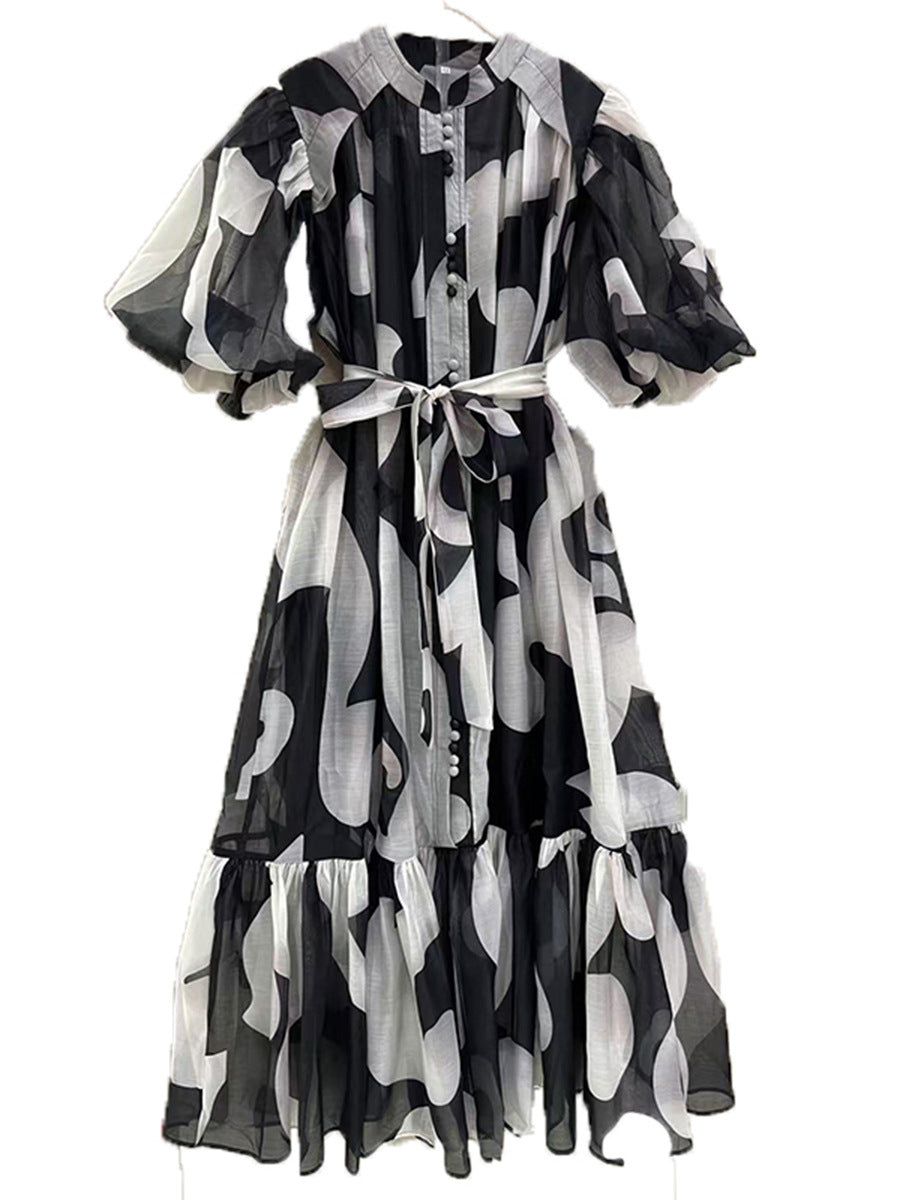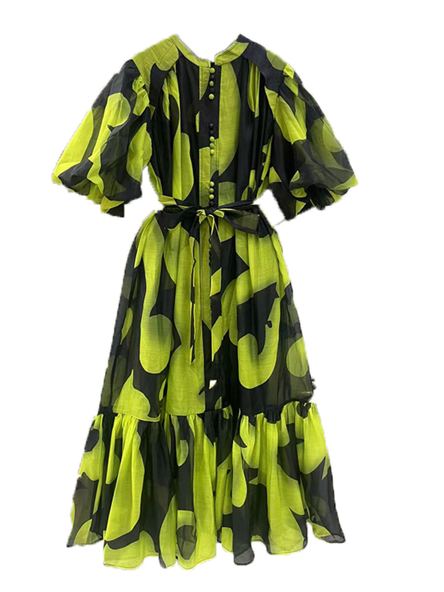 Style Dress 2025 Summer New Retro Printing And Dye Single Buckle Bubble Sleeve Fashion Casual Dress