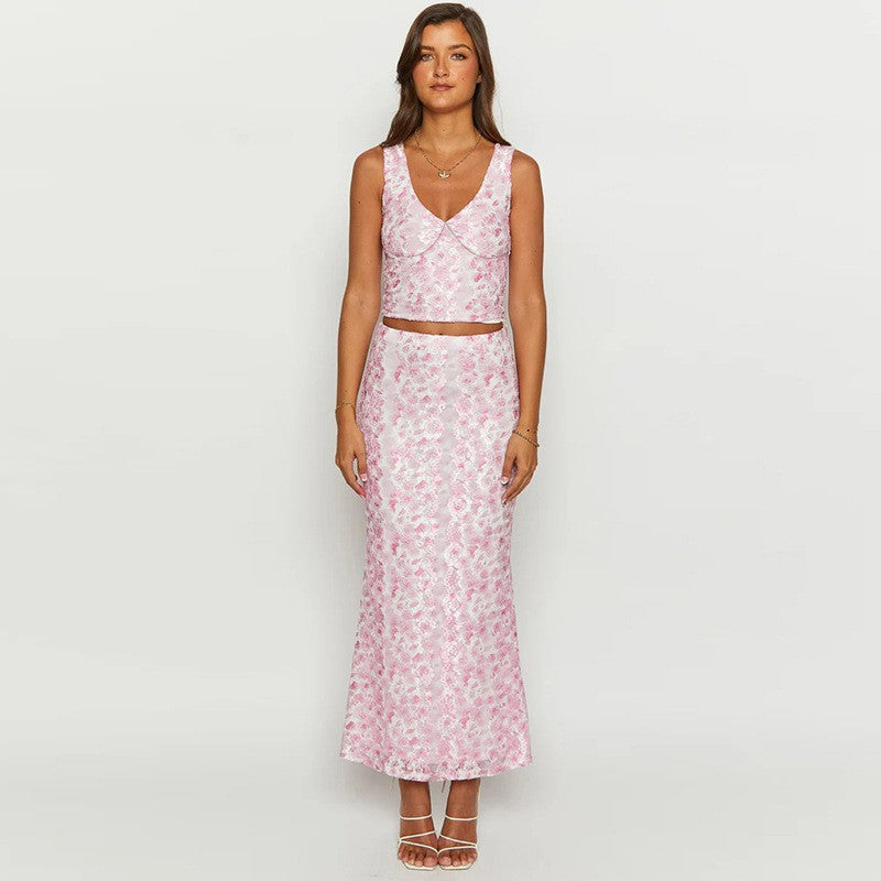 Summer 2025 New Women's Clothing Fashion Casual Floral Vest Half-Skirt Suit Women DJPT