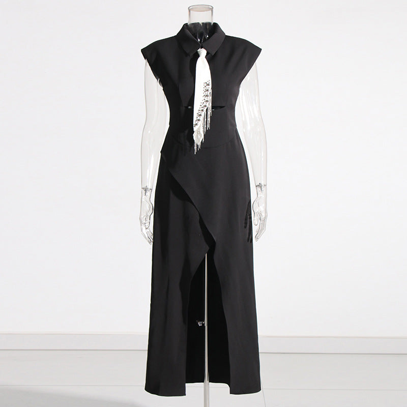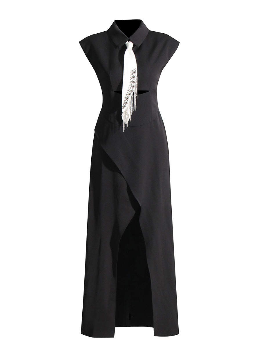 Summer New Fashion High Street Wind Flip-Neck Flying Sleeve Tie Design Nail Drill Open Dress Dress Woman