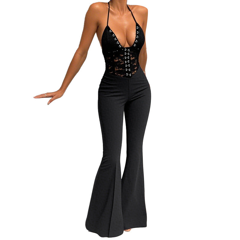 Summer New Hanging Neck Sexy Lace Slings With Jumpsuits Showing Thin Trousers DJPT