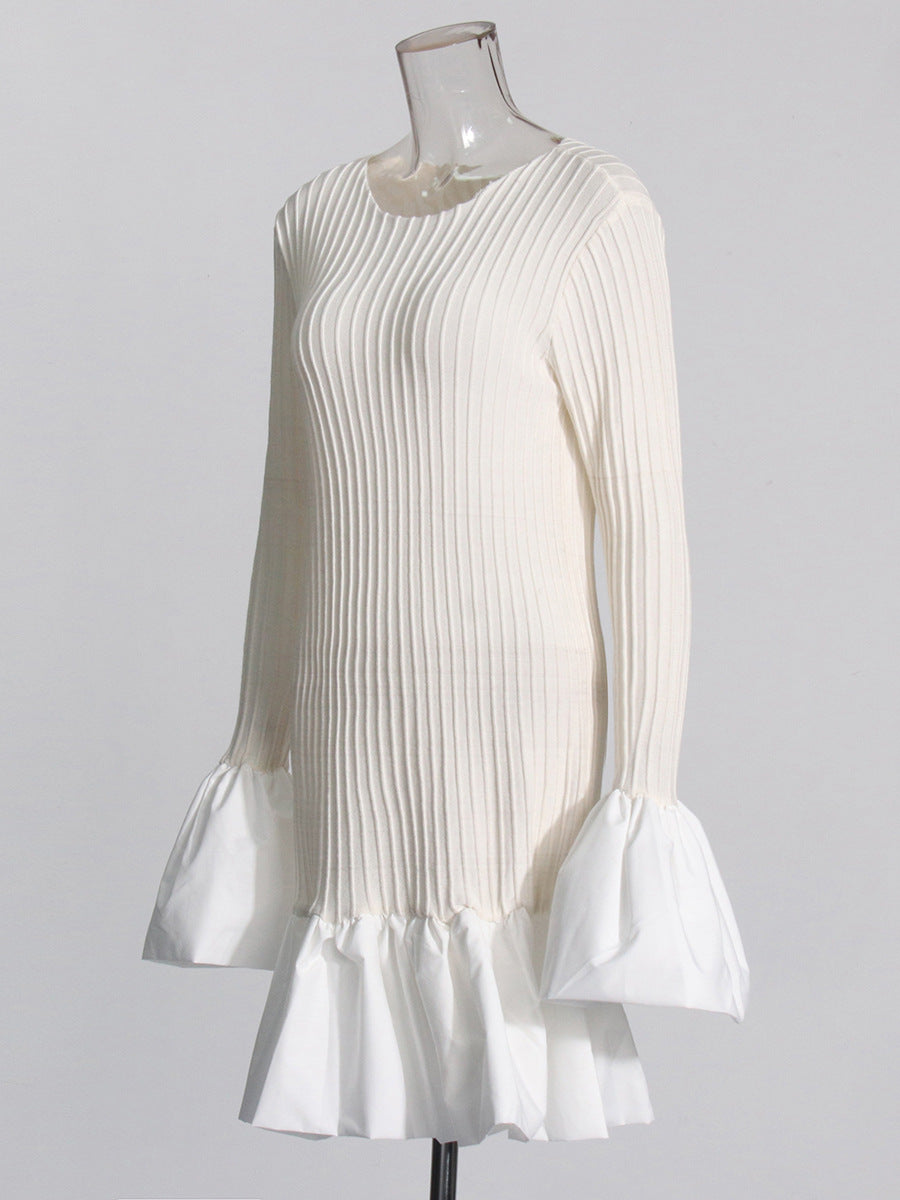 Summer New Temperament Retro Style Wind Wind Collar Lotus Side Splicing Horn Sleeve Knitted Dress Woman