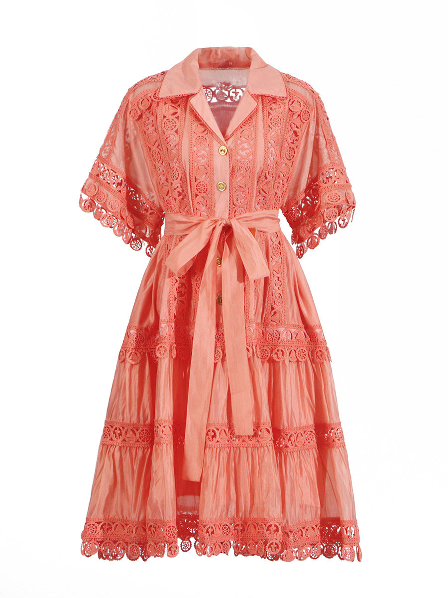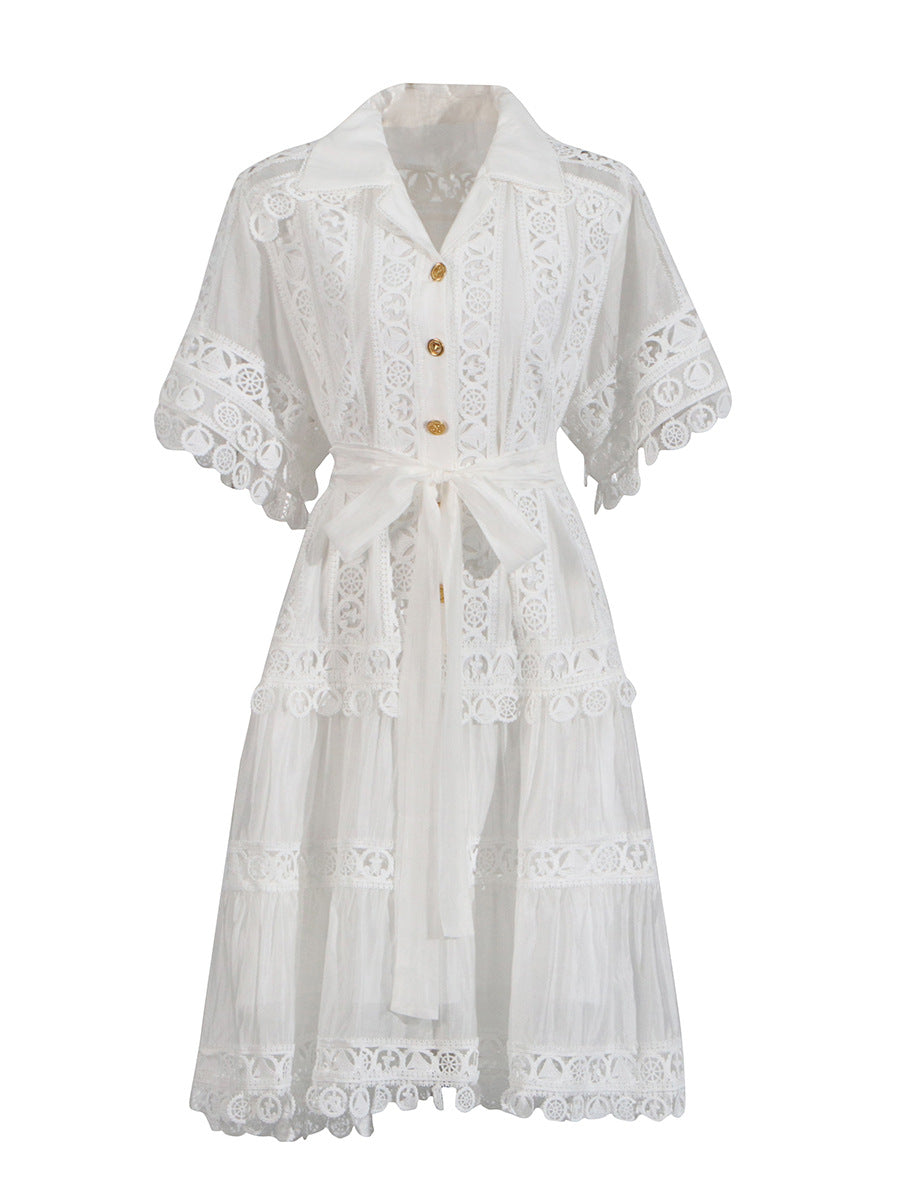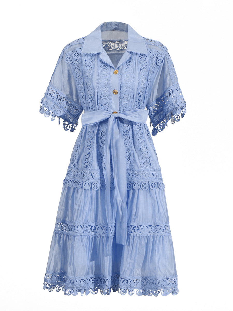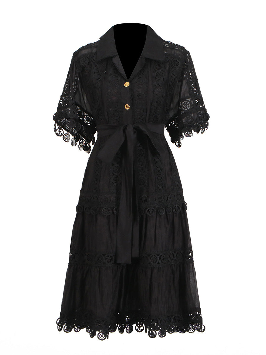 Temperament Vintage Short Dress 2025 Summer New Collar Embroidered Hollow Lace Dress Dress Woman