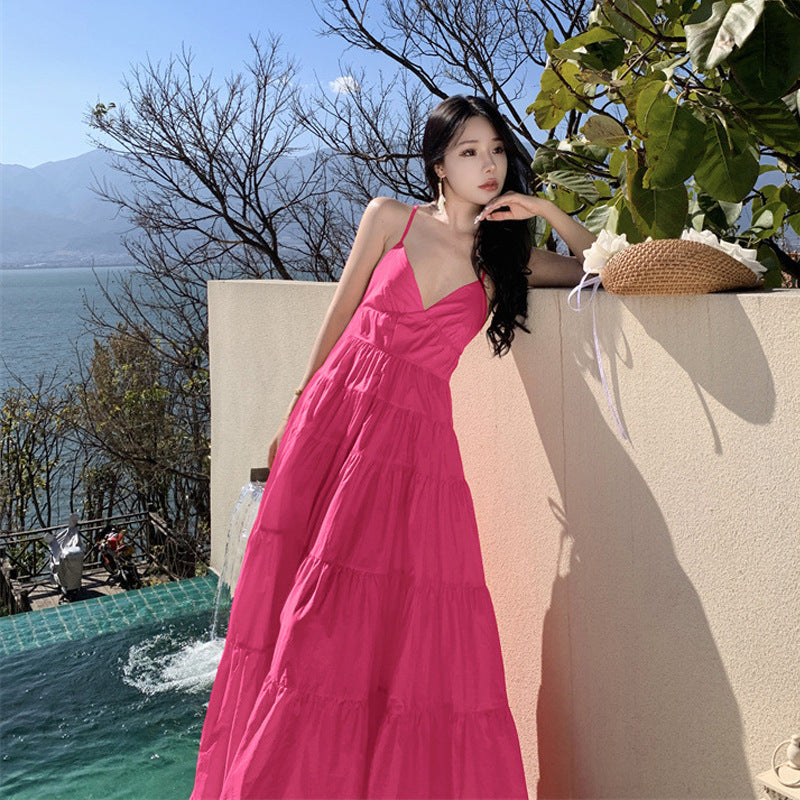 Tourism Photo Fairy Dress Rose Red Deep V Collar Bare Back Sling Dress Sanya Seaside Beach Dress Girl
