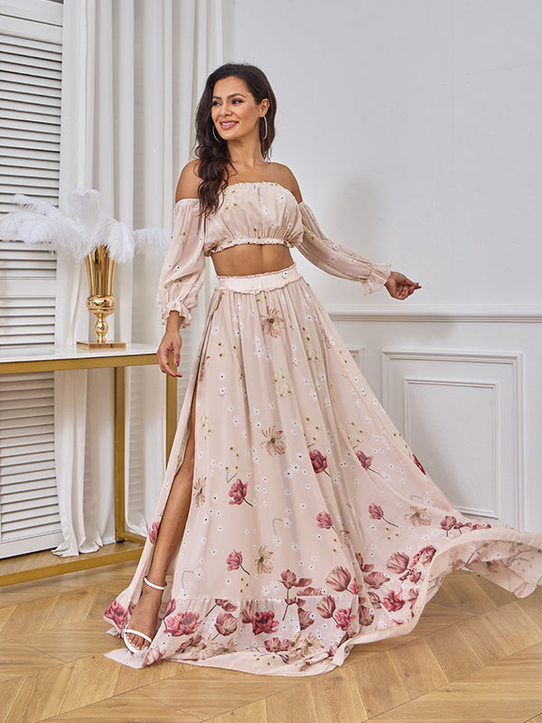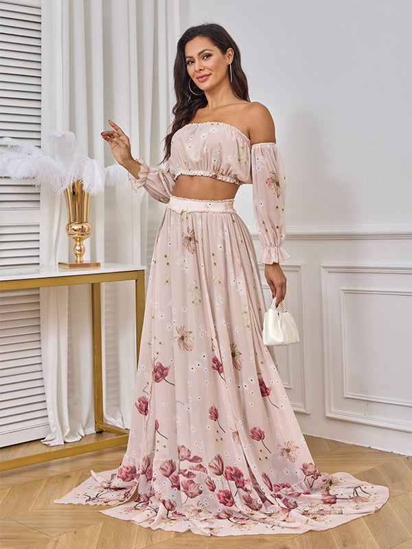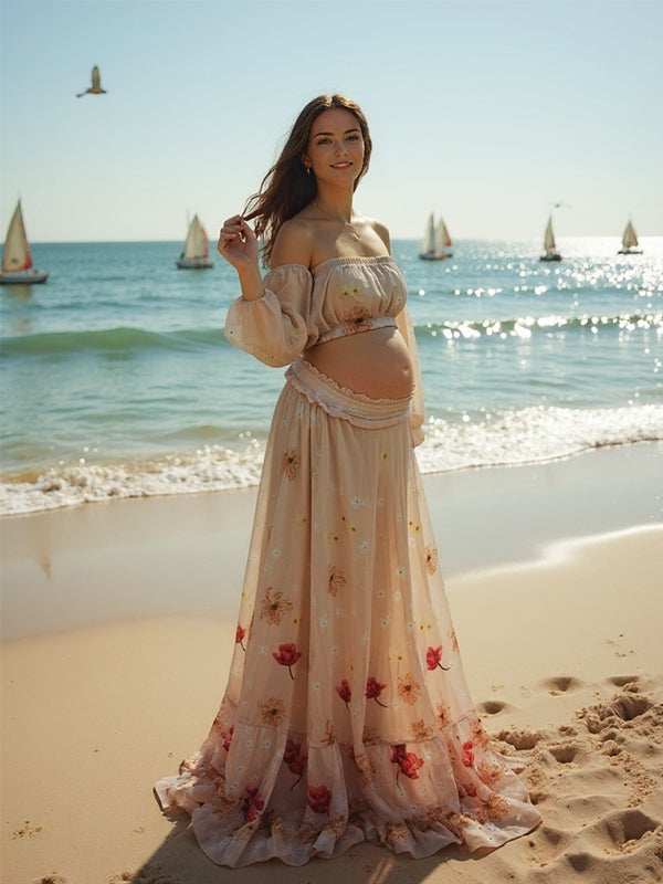 Two Piece Boho Flower Printing Off Shoulder Chiffon Crop Bandeau Photoshoot Maternity Maxi Dress Maternity