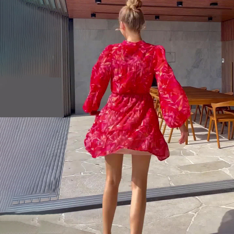 V-Neck Print Lantern Sleeve Chiffon High-Waisted Dress In Autumn 2024