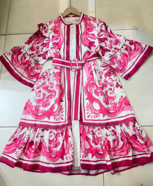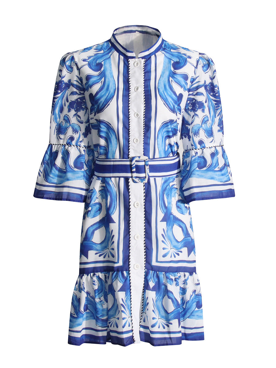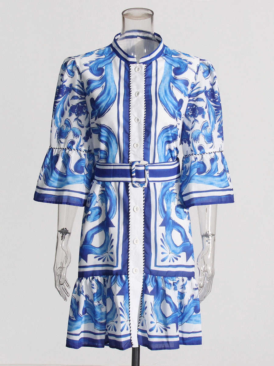 Vintage 2025 Summer New Round-Neck Long Horn Sleeve Blue Printed Dress Woman