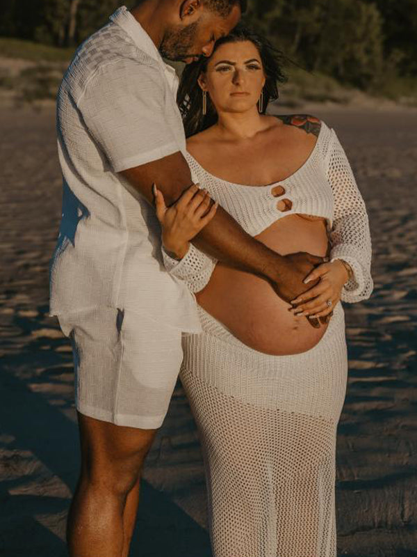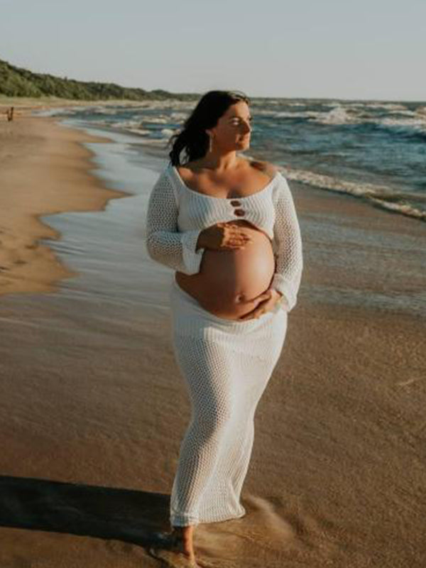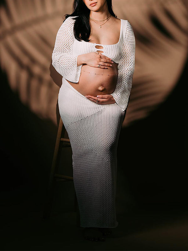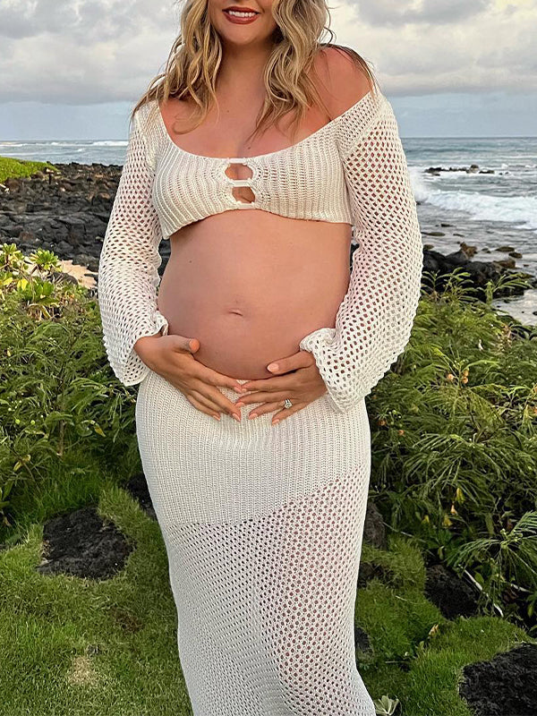 White 2 Piece Crochet Mesh Backless Flare Sleeve Bodycon Vacation Beach Photoshoot Baby Shower Maternity Maxi Dress Maternity