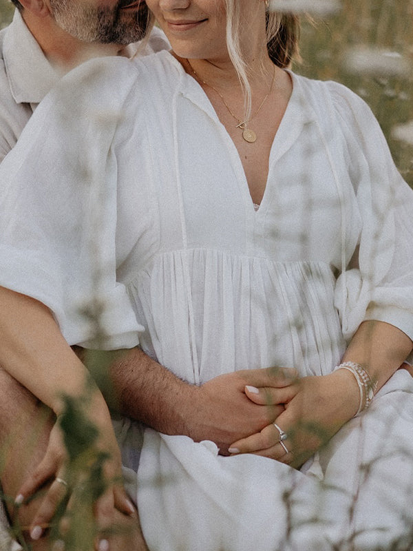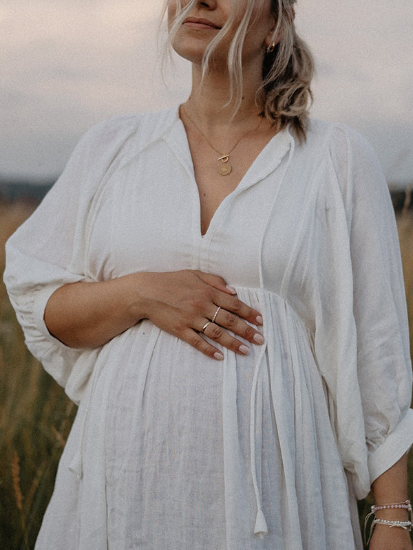 White Front Tie Up Deep V-neck Lantern Sleeve Loose Sundress Elegant Vacation Baby Moon Flowy Boho Maternity Photoshoot Baby Shower Maxi Dress Maternity