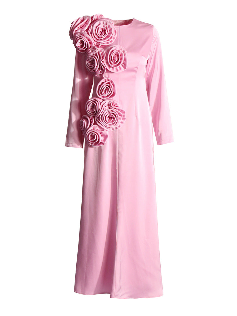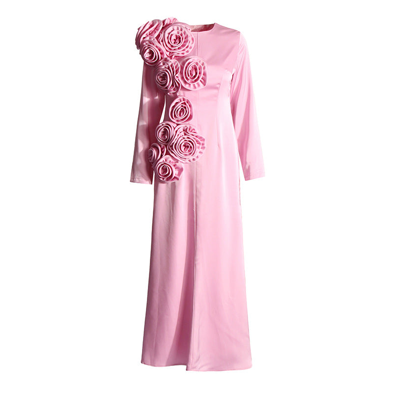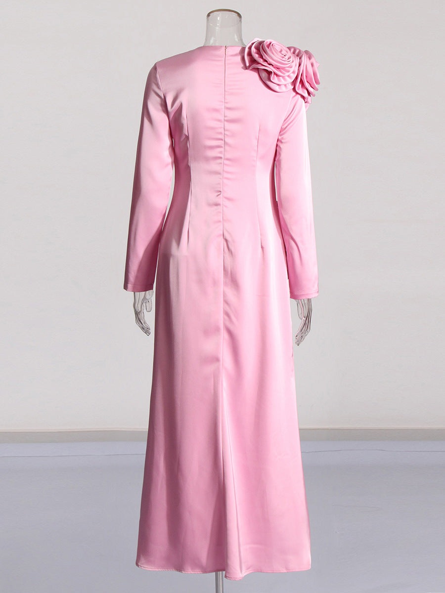 Wind Party Dress 2025 Summer New Round Neck Side Three-Dimensional Flowers Decorated Solid Color Repair Dress Dress Woman