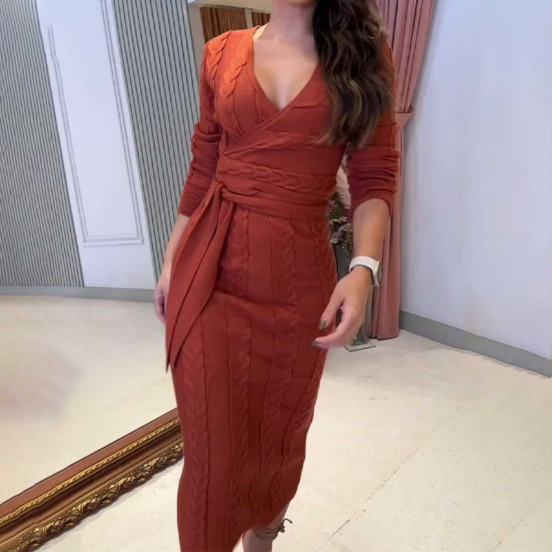 Women's Autumn V-Neck Long Sleeve Knitted High Waisted Tice With A Tinged Dress