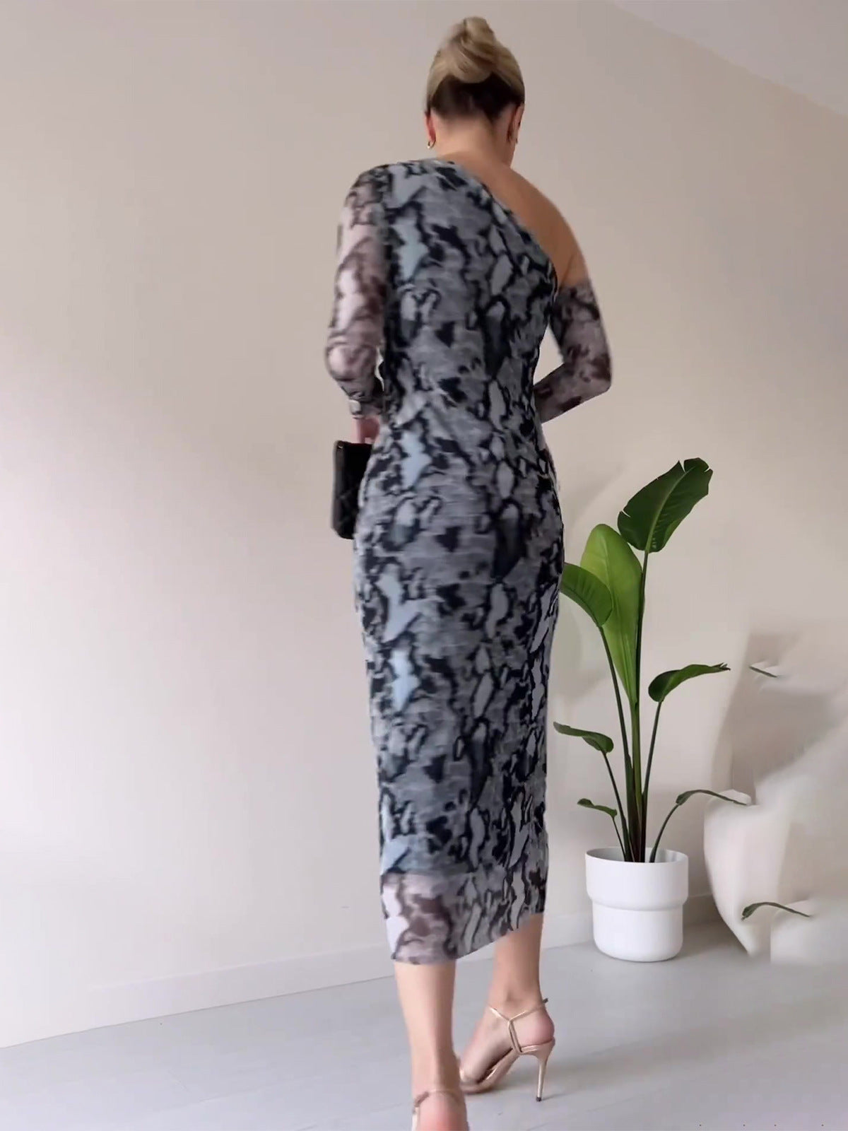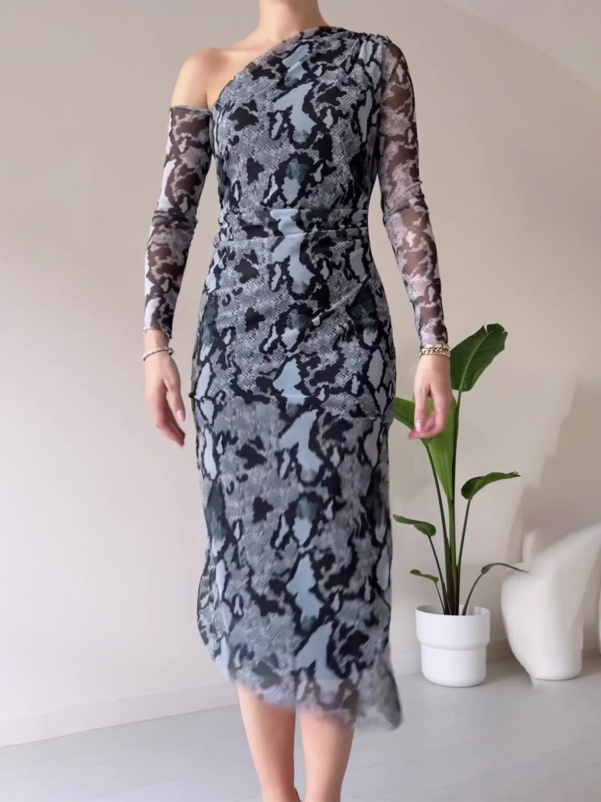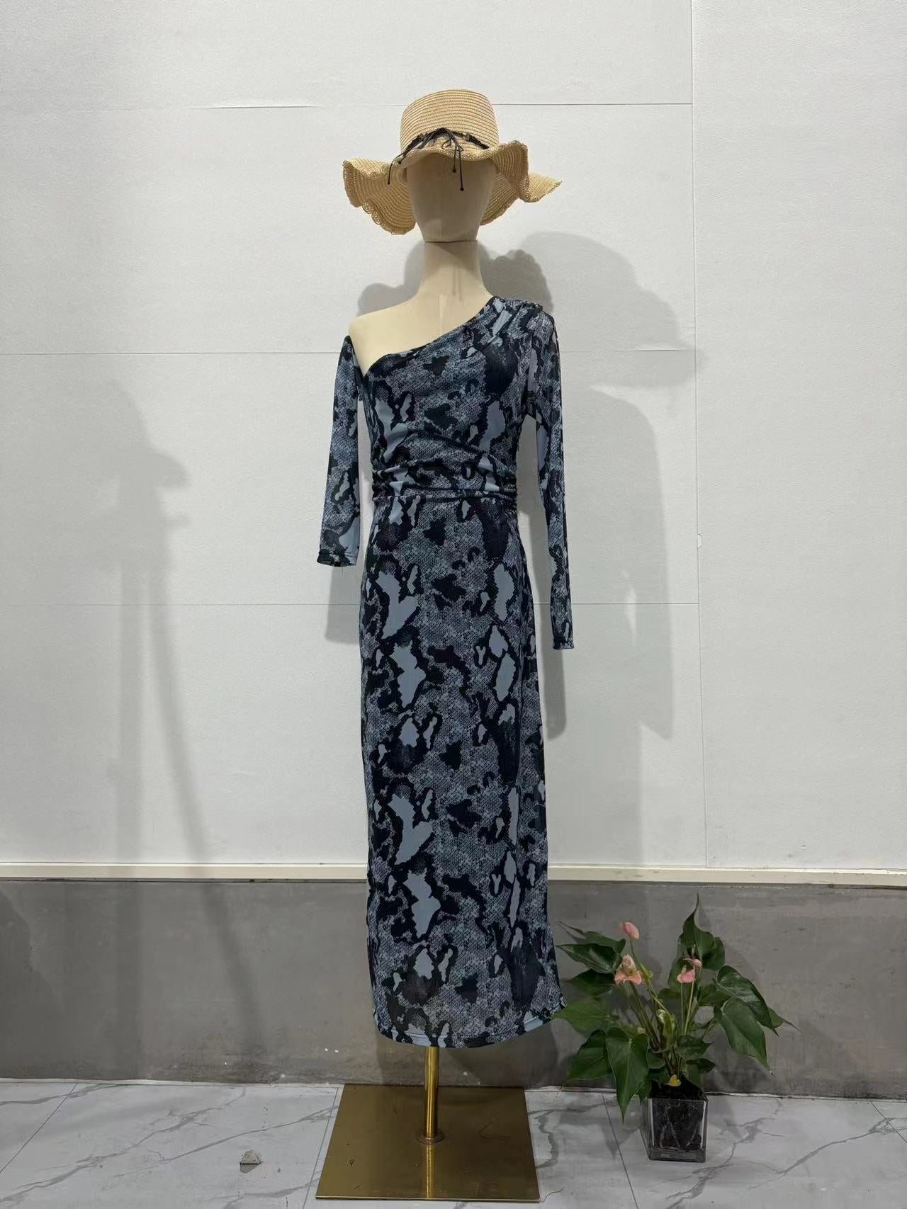 Women's Clothing 2025 Autumn New Snake Print Long-Sleeved Bag Hip Sexy Dress